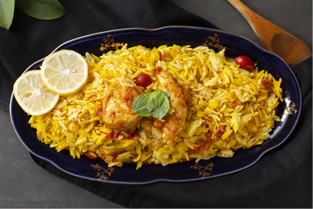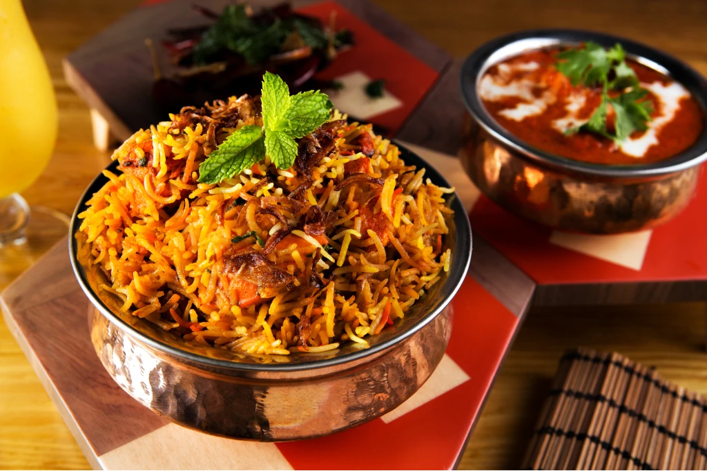 En festmåltid av långkokt kött tillagad med basmatiris och saffran. Serveras med en youghurt-baserad mellanstark sås.