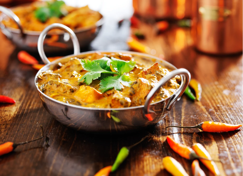 Kycklingfilé i en traditionell curry och tomatsås med kasmeri pest.